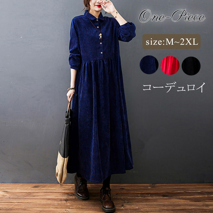 ロングワンピース レディース 春 コーデュロイ ワンピース ロング丈 マキシ丈ワンピース 長袖 大きいサイズ 体型カバー オシャレ