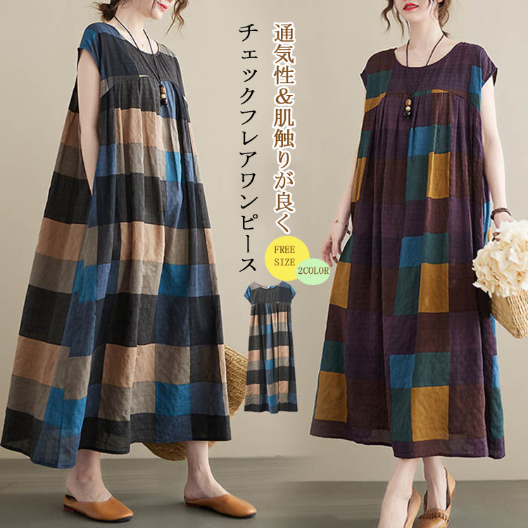 肌触りが良く、通気性に優れ&シンプルながらも上品 チェック柄ワンピース お洒落 柔らか 大きいサイズ タック入り ギャザー フレア