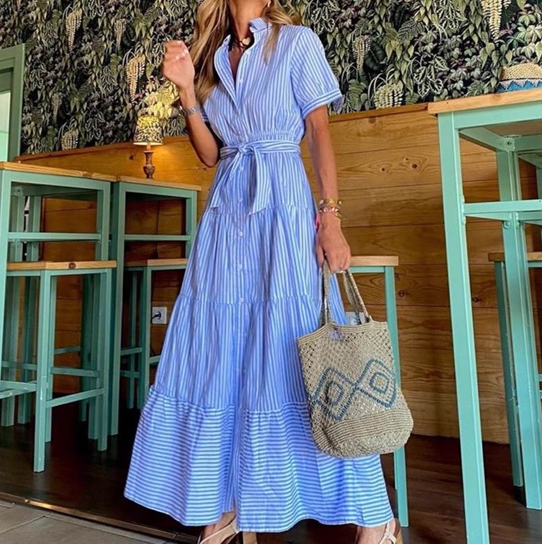 レディース ワンピース シャツワンピ フレア ティアード ロング マキシ 半袖 ネック 襟付き フレア ウエストマーク ウエストリボン ハイウエスト 切り替えデザイン ベルト付き 大人可愛