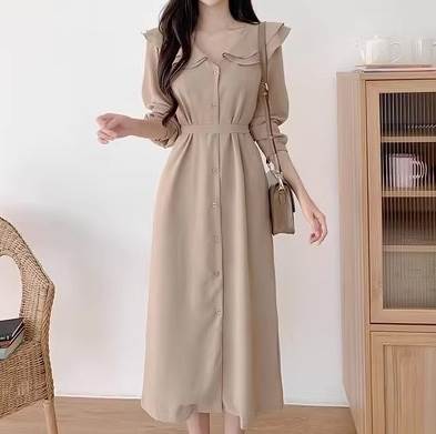 レディース ワンピース シャツワンピ フレア ミモレ ロング 長袖 Vネック 襟付き 丸襟 フレア Aライン フェミニン フリル リボン ウエストマーク ウエストリボン バックリボン