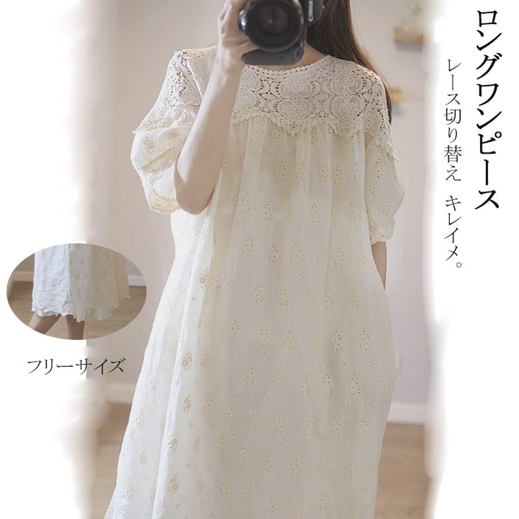 5分袖刺繍レースコットンロングワンピース 五分袖 ロングワンピース コットン 綿 天然素材 小柄 春服 春物 春用 春夏 夏服 夏物 夏用