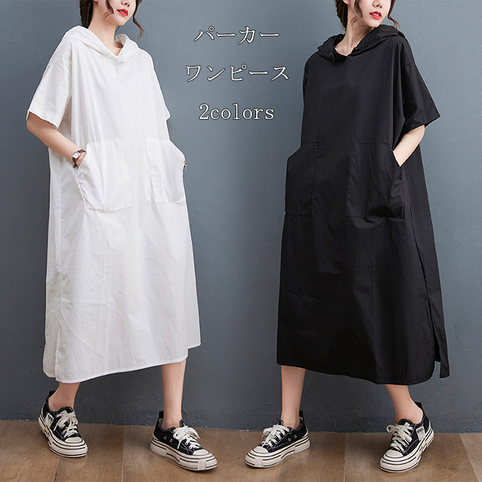 ワンピース パーカーワンピース 夏 秋 フード フードワンピ ロング スリット 無地 フード付き ポケット付き ゆったり カジュアル 通勤 通学 オーバーサイズ