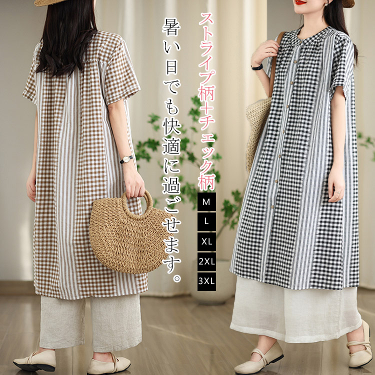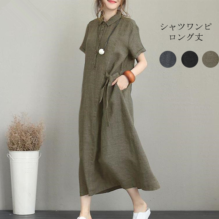 ワンピース ロングワンピース レディース シャツワンピース ロング丈 ロングワンピ 半袖 マキシワンピ ゆったり 体型カバー 夏 綿 無地 薄手 大きいサイズ フォーマル