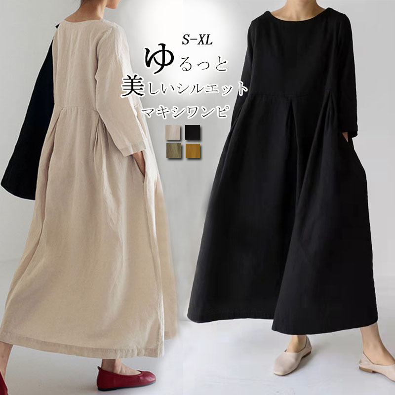 ワンピース 春 きれいめ ロングワンピース レディース 夏ワンピース 体型カバー ロング 無地 フレア 五分袖 半袖 ギャザー ゆったり カジュアル 50代 40代 30代 ブラック 黒 L XL