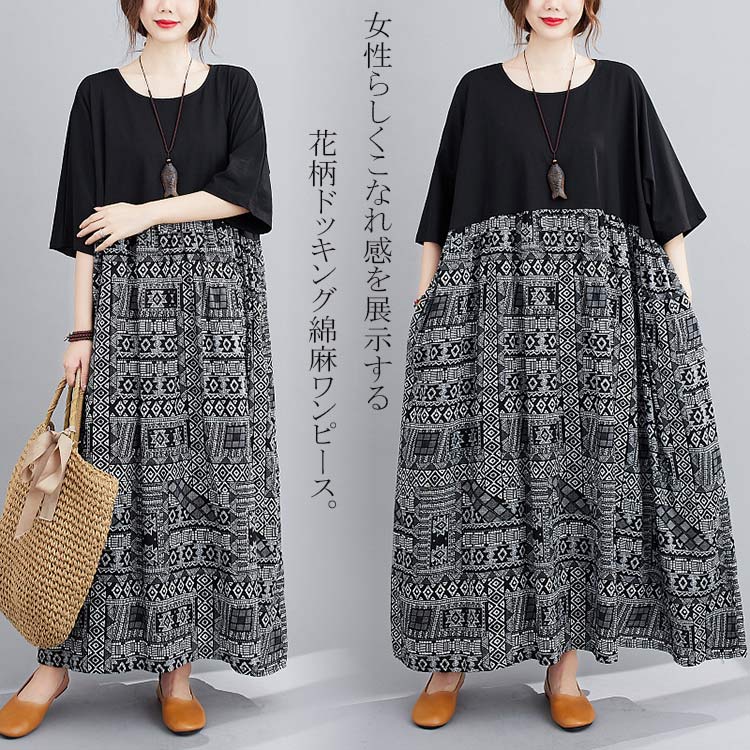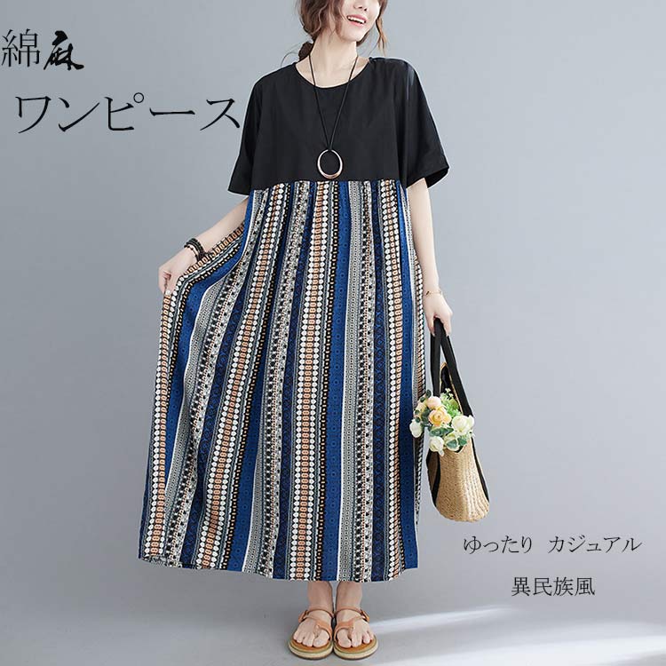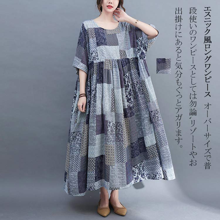 ワンピース ロングワンピース マキシワンピース エスニックワンピース コットンリネン 綿麻 プリント リゾートワンピース ワンピ