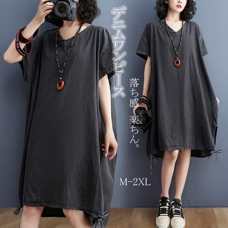 デニム ワンピース ゆったり 可愛い カジュアル 半袖 Aライン 膝丈 Vネック チュニックワンピース レディース デニムワンピース ゆったり 可愛い カジュアル ロングTシャツ 秋服 夏服