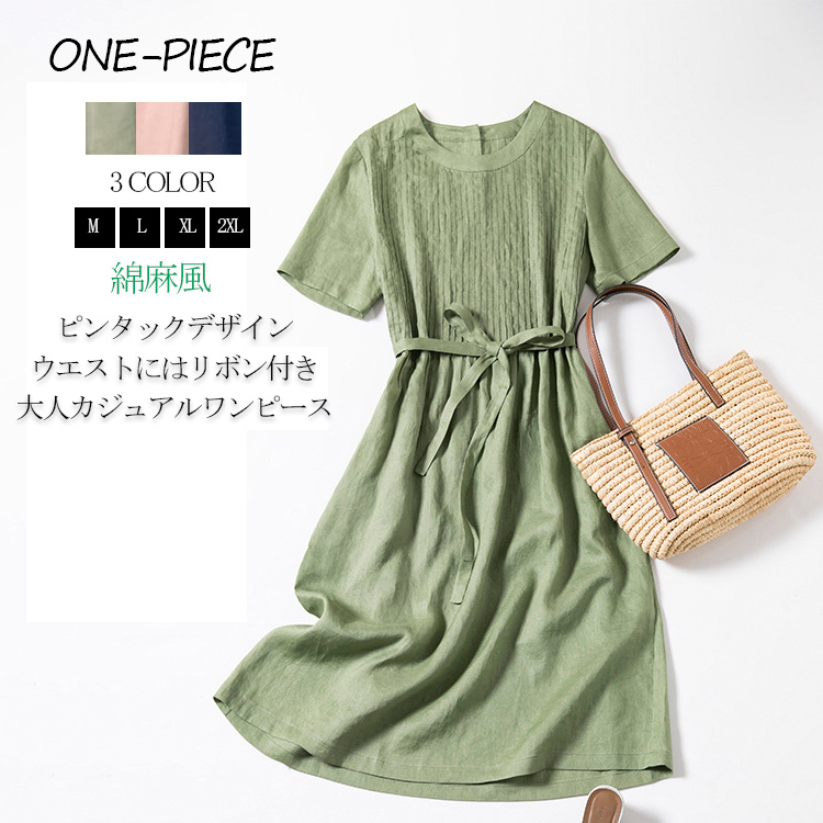 リボン ワンピース 夏 レディース フレア aラインワンピース 大きいサイズ ピンタック Aライン 半袖ワンピース 綿麻 膝丈 ラウンドネック 半袖 着痩せ ゆったり 20代 30代 40代