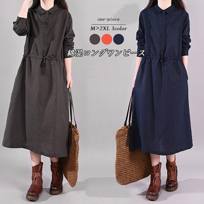 ワンピース レディース 春 長袖 ロングワンピース 大きいサイズ 襟付き ウエストリボン ミモレ丈 綿混 コットン混 ゆったり 無地 20代 30代 40代 50代