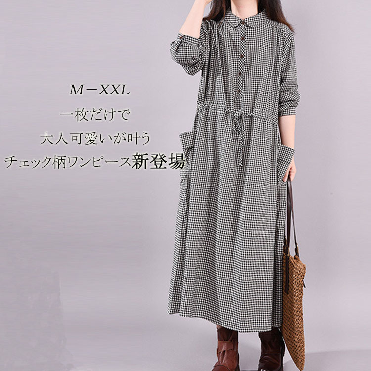 ストライプワンピース チェックワンピース 体型カバー 春 ゆったり ロング丈 ひざ下丈ワンピース タック入り ポケット付き ロングワンピース ロング きれいめ