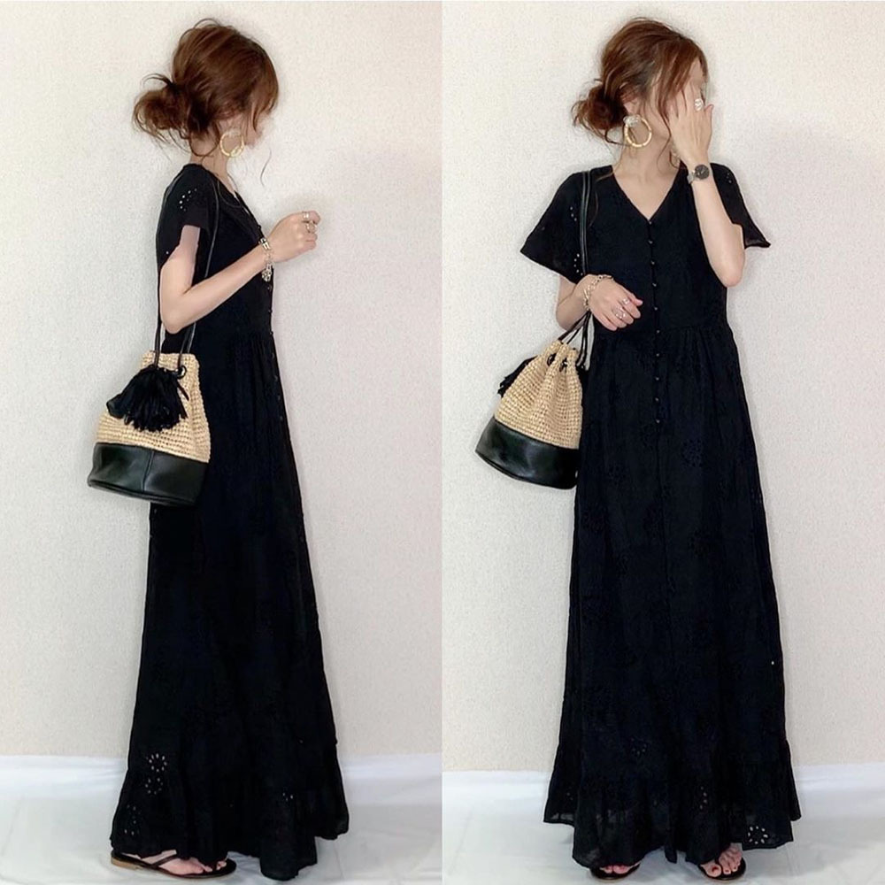 ワンピース レースワンピース Vネック 無地 マキシワンピース 透かし彫りワンピース 夏 ロングワンピース 通勤 韓国風
