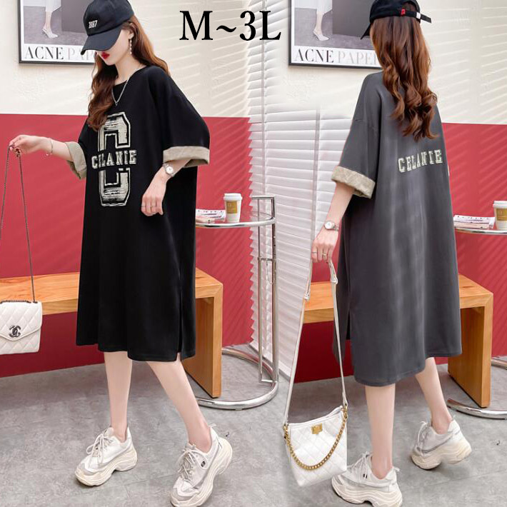 Tシャツレディース夏 半袖大きいサイズワンピースポケットロゴワンピTシャツワンピロングTシャツスリット膝丈スウエット部屋着ゆったり楽ちんML2L3L