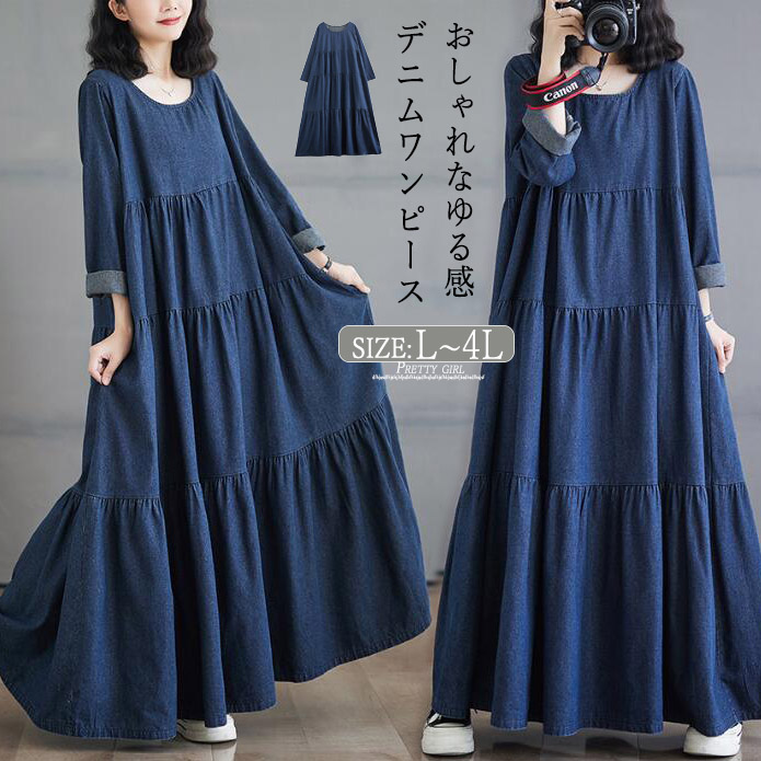 デニムワンピースロングワンピースティアードレディース長袖ワンピラインデニムゆったり オーバーサイズマキシ丈ロングカジュアル 森ガール 着痩せ大きいサイズ体型カバー 春秋