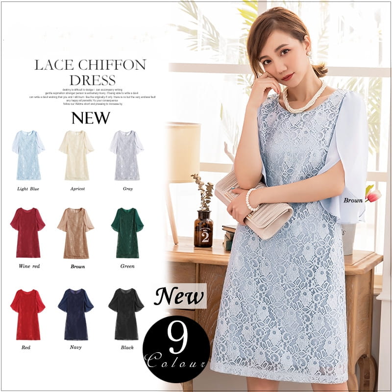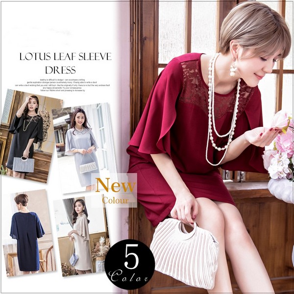 パーティードレス ワンピース ビジュードレス ミディアムドレス レース シフォン ドレープ 袖有り 膝丈 ハーフ丈