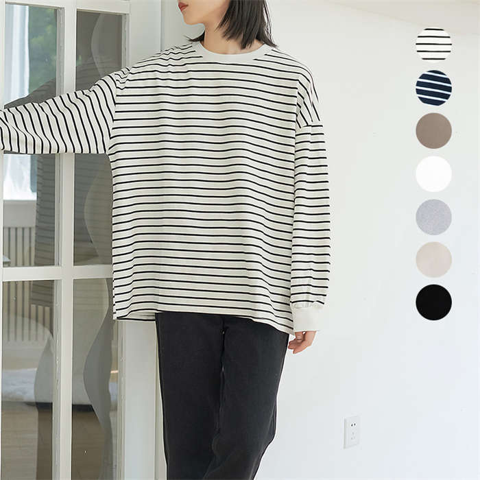 定番人気のボーダートップス カジュアルながらも広めのネックラインで女性らしい着こなしが叶います ドロップショルダーデザインで大人なこなれ感を演出