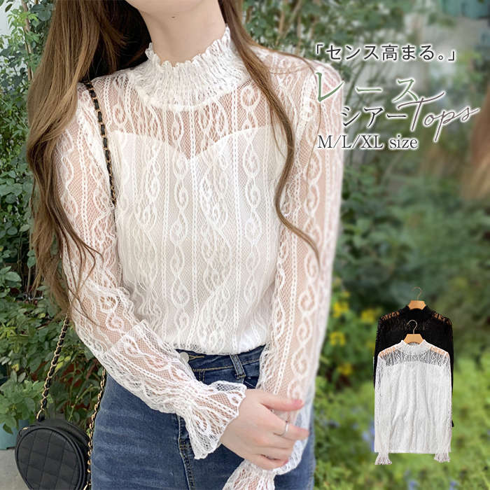 レース トップス 透け感 ブラウス シアー レディース ハイネック 立ち襟 長袖 総レース シースルー インナー 春 夏 秋 レイヤード Tシャツ カットソー シアートップス セクシー おしゃれ きれ