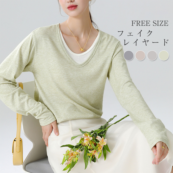重ね着をしてるようなデザインカットソー おしゃれ 人気 シーズンレス 長袖 重ね着風 オールシーズン