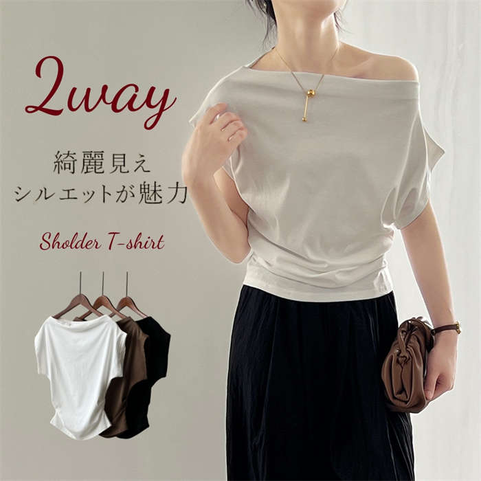 人気新作~ オフショルダーTシャツ 2way T-shirt 春夏 フリーサイズ F ホワイト ブラック コーヒー 白 黒 茶 ♪