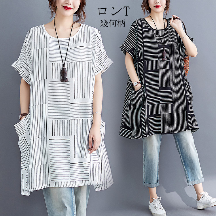 Tシャツ ロングTシャツ 夏 プルオーバー ロンT トップス レディース コットン チュニック 半袖 総柄 幾何柄 シンプル ゆったり カジュアル風