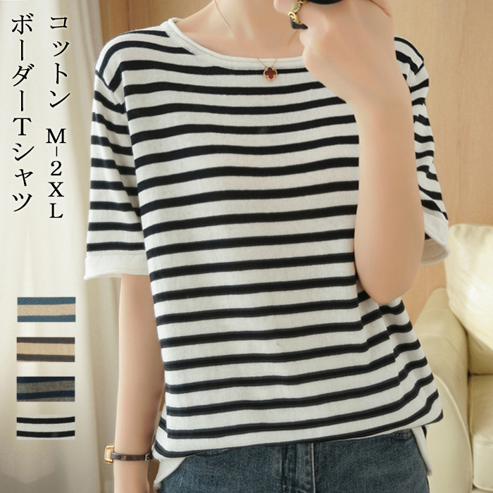 ボーダーTシャツ クルーネック 綿 コットン 半袖 シンプル 夏 Tシャツ プルオーバー レディース トップス コーデ 柔らか おしゃれ きれいめ カジュアル