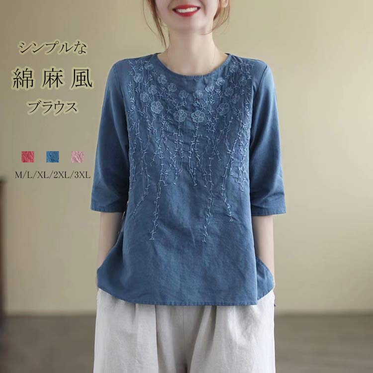 ブラウス レディース 7分袖 春 夏 トップス 丸首 綿麻 刺繍 体型カバー ゆったり 大きいサイズ プルオーバー カジュアル 前後差 30代 40代 50代