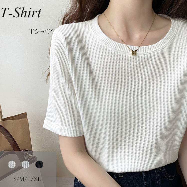着と涼しいデザイン感あるオシャレなレディースTシャツ Tシャツ 夏Tシャツ ワッフル生地 プルオーバー 半袖 綿混 ブラック ホワイト カジュアル 可愛い 大人 夏