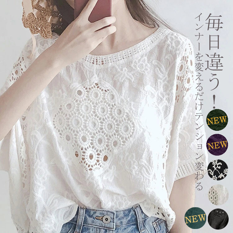 毎日違う インナーを変えるだけテンション変わるブラウス 柔らかく涼しいレースブラウス 可愛い 夏服 年齢にこだわりなく幅広く着られるレーストップス レース刺繍トップス 低身長