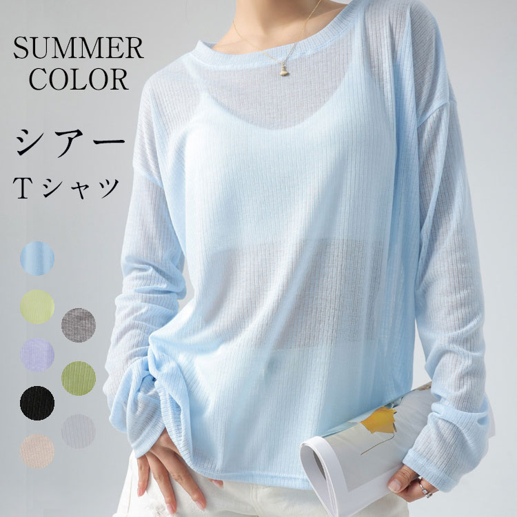 シアートップス シアーtシャツ 夏 長袖uvカットtシャツ クリーム色 ラウンドネック 伸縮 可愛い きれいめ 抜け感 大人可愛い 長袖tシャツ リブ カットソー 長袖