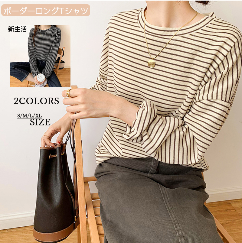 ボーダー ロング カットソー プルオーバー 長袖トップス レディース ロング プルオーバー 長袖 クルーネック シンプル カットソー ロンT 春 ゆったり