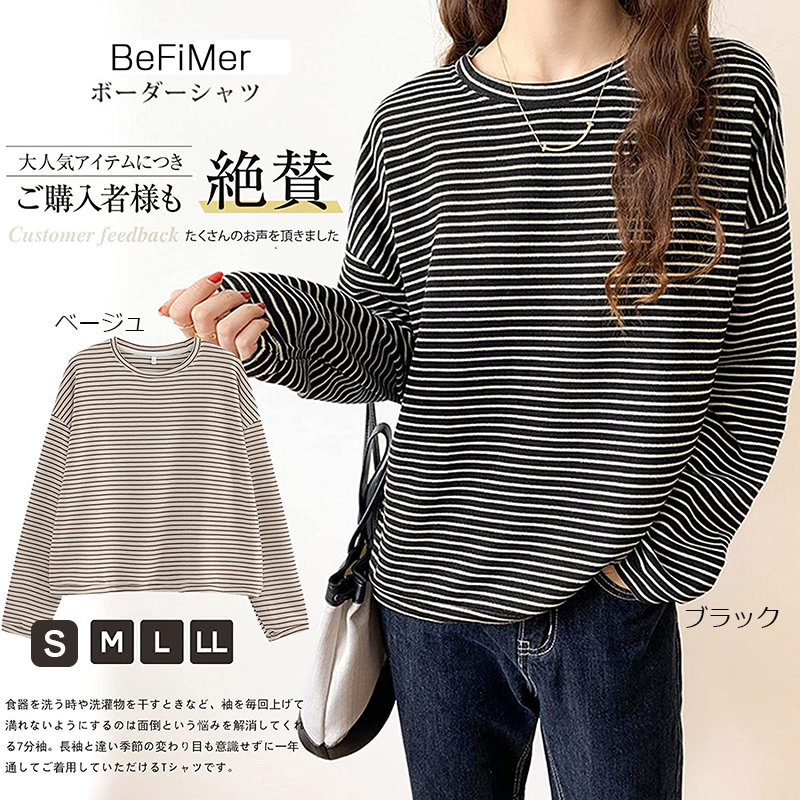 レディース 長袖 トップスクルーネック 細ボーダー シャツ カットソー 袖折り返し シンプル レイヤード 20代 30代 40代 50代