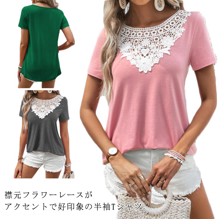 S-XL 美デコルテ 胸元レース Tシャツ 半袖カットソー 華奢見せ 細見せ 美人 可愛い ゆったり フェミニン