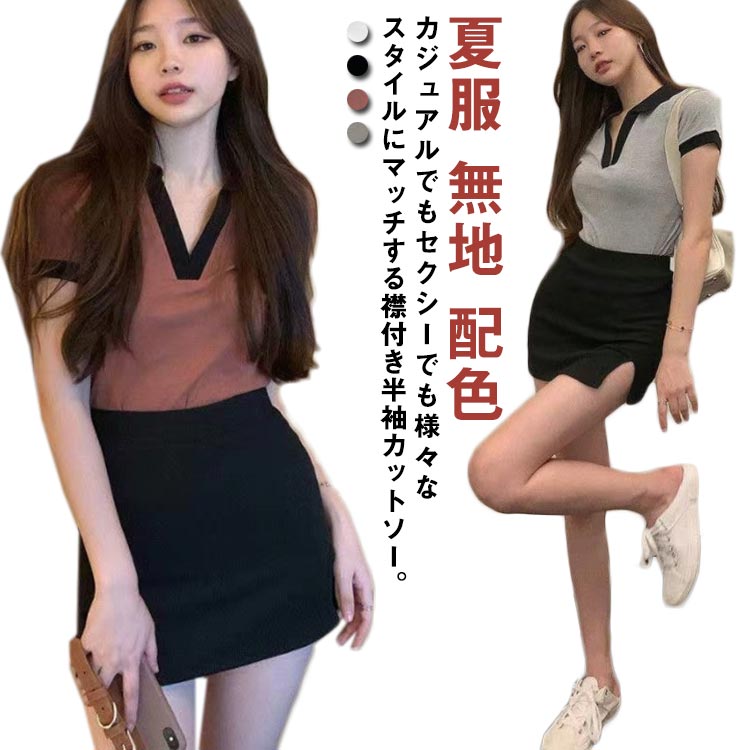 美デコルテを演出♪ スキッパーカラー カットソー 半袖 トップス ストレッチ 襟付きレディースファッション トップス Tシャツ カットソー