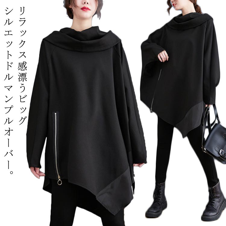遊び心いっぱいの1枚 ハイネック ストレッチ カットソー 尻が隠れる オーバーサイズ 長袖 黒 無地