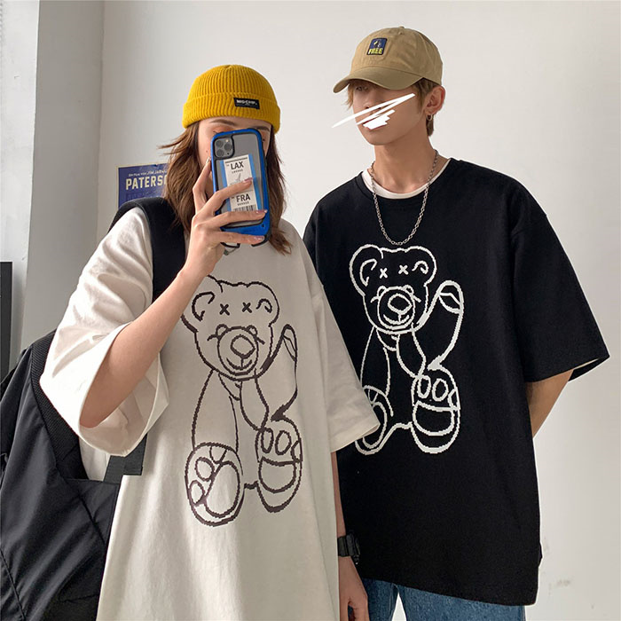 ペアルックtシャツ かわいい オシャレ お洒落 クマ柄 肌触りいいシンプル お揃い 服 記念日 プレゼント シンプル ナチュラル 半袖 綿 ゆったり 柔らかい