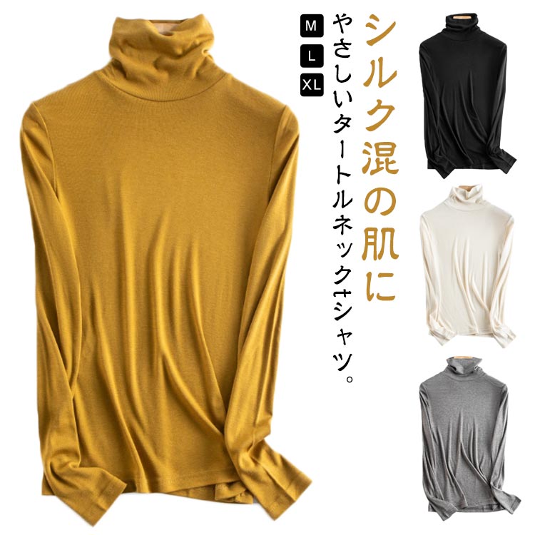 プレゼント 一枚着用 オシャレ 長袖 ハイネック 絹 シルク混 ティーシャツ カットソー タートルネック インナー シルク 重ね着 シンプル シャツ 肌に優しい 敏感肌 低刺激 快適 保湿 汗取り