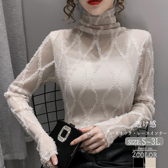 レースインナーレディース総レース花柄刺繍カットソーシースルーレース 肌着 トップスハイネック立ち襟セクシー長袖 透け柔らかい 重ね着 きれい春秋冬SML2L3L