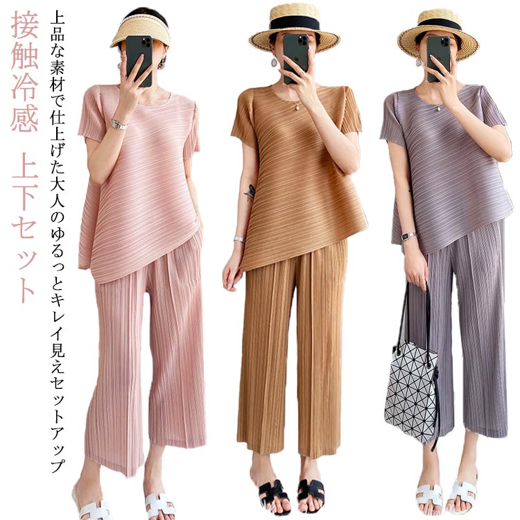 レディース ブラウス セットアップ フォーマル ひんやり 半袖 ワイドパンツ オフィス 接触冷感 韓国 カジュアル tシャツ ガウチョパンツ トップス ボトムス ゆったり 涼しい 夏 無地 ズボン 春