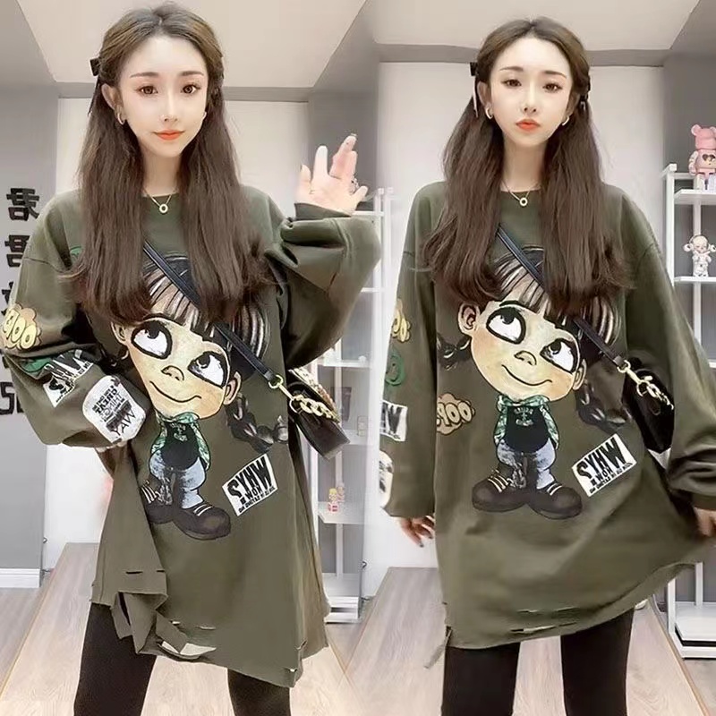 レディース ロングシャツ 春秋 ロング ゆったり 可愛い ダメージ加工 プリント 丸首 長袖 大きいサイズ おしゃれ 331
