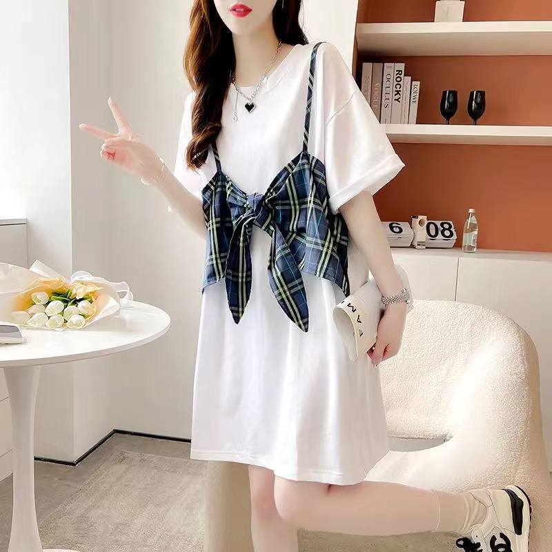 Tシャツ レディース 夏 トップス 半袖 ゆったり チェック柄 重ね着風 リボン付きレディースファッション トップス Tシャツ カットソー
