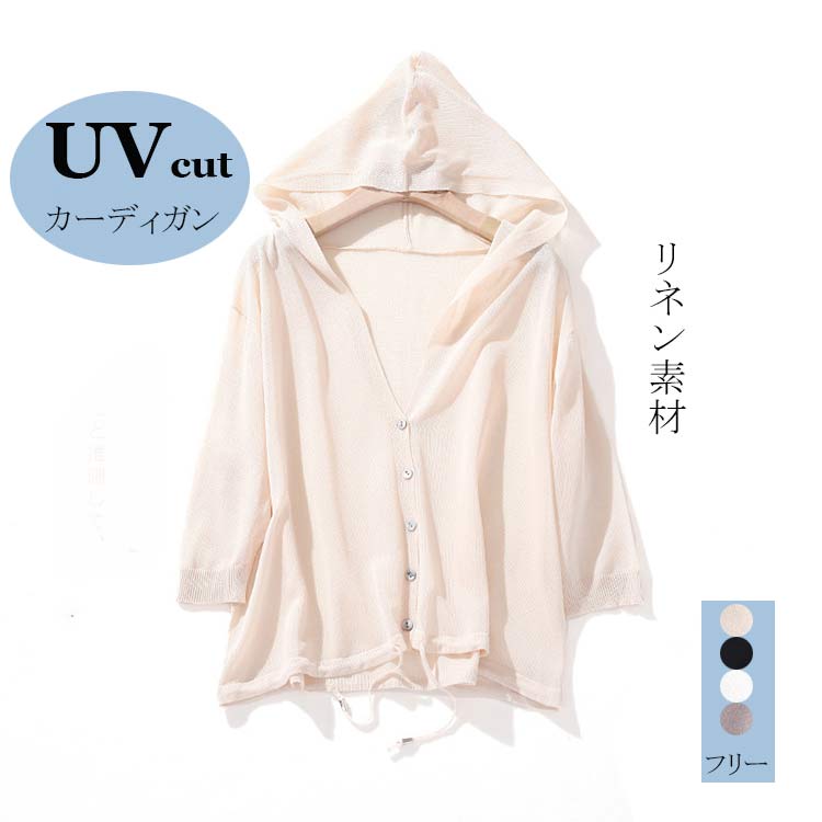 着るだけUVカット七分袖透け感ありフード付きリネンサマーニットカーディガン カーディガン 日焼け止め ドロップショルダー 大人 薄手 フェミニン カットソー 無地 涼しい 快適 夏