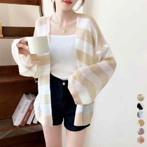 ニット羽織り 透け編み ボーダー柄ボレロカーデ サマーニットトップス バイカラー春夏秋カジュアル ライトアウター冷房対策 羽織り透け感 薄手 体型カバー通勤 ボリューム袖 軽い
