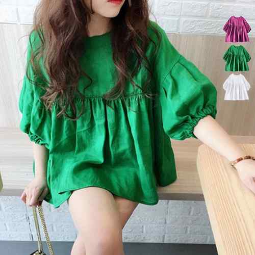 バルーンスリーブブラウス オフィスカジュアルトップス 七分袖 白 通勤 大人上品プルオーバー 韓国風 20代30代40代 ギャザーブラウス夏 ライン体型カバー ボリューム袖着やせ
