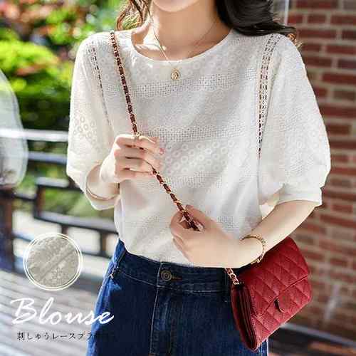 レース花刺しゅう ブラウス レディース ゆったり シャツ5分袖 クールネック トップス プルオーバー レース ブラウス 透け感 トップス きれいめ シャツ