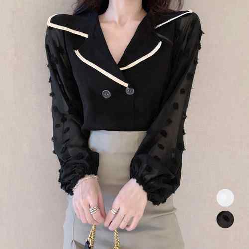 ネック ニットブラウス ダブルブレスト 袖切り替え おしゃれニットトップス オフィスカジュアル 大人可愛い 韓国春秋夏 袖チュールニット春 スキッパーブラウス ショート丈トップス