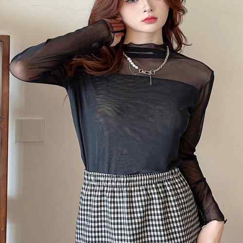 シースルーシャツ 薄手 レイヤード おしゃれ 重ね着 インナートップス 長袖チュールカットソー セクシーシアーブラウス インナー大人可愛い モックネック春秋服 透け感トップス大人