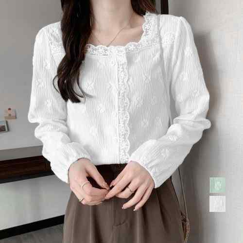 長袖シャツ レディース 大人かわいい トップス 薄手 スクエアネック お洒落 通勤 ブラウス 前開き フェミニン オシャレブラウス フラワーレース 韓国ファッション