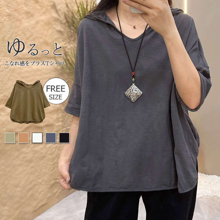 フード付き tシャツ レディース 半袖 ゆったり カジュアル 春夏 薄手 無地 ショート丈 トップス カットソー プルオーバー 大人 きれいめ お洒落 体型カバー 通勤 シンプル 20代 30代 40