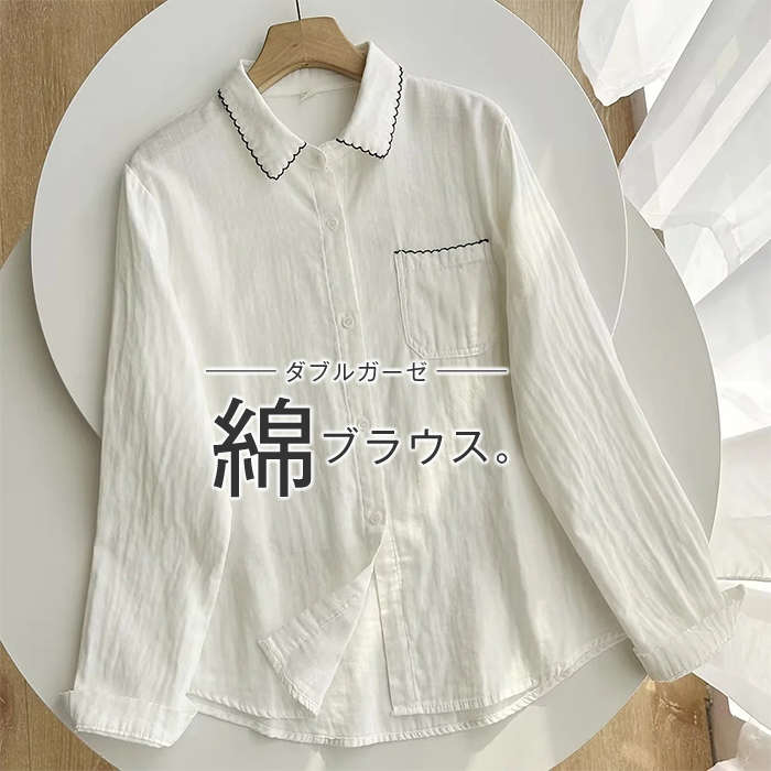 シャツ ブラウス レディース 長袖 綿100% ガーゼ シャツブラウス ダブルガーゼ トップス チュニック 折り襟 無地 コットン100% 2重ガーゼ ベーシック フォーマル 体型カバー 通気性良い