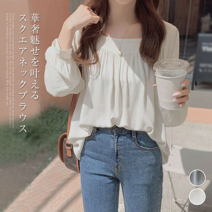 スクエアネック ギャザーブラウス、程よい透け感があるので、女らしさが漂うスタイルに♪レディースファッション トップス シャツ ブラウス