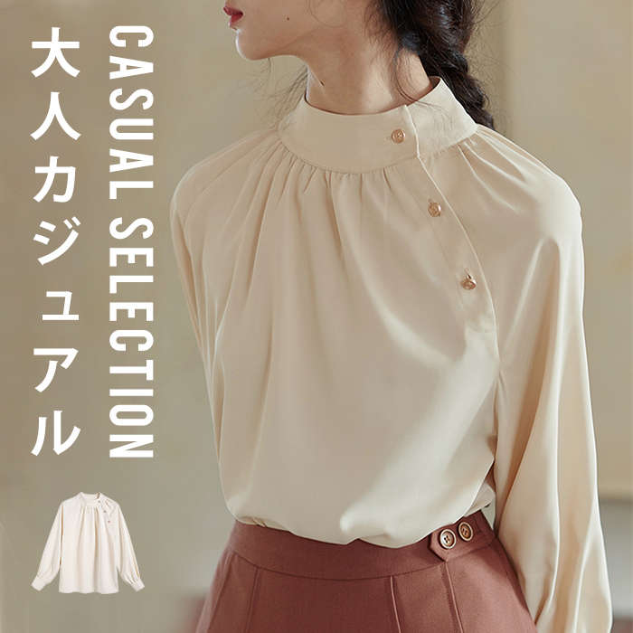 ブラウス シャツ レディース トップス インナー スーツインナー ビジネススーツ 長袖 スタンドカラー 飾りボタン付き オフィスカジュアル フォーマル 上品 着痩せ 体型カバー 小顔効果 春夏 春 夏
