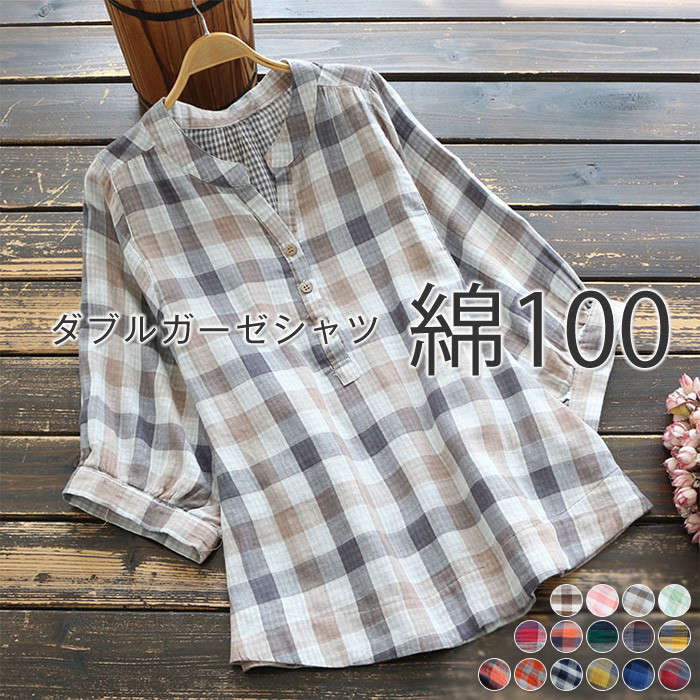 シャツ レディース おしゃれ チェック柄 5分袖 ダブルガーゼシャツ ブラウス yネック スタンドカラー 夏 トップス フォーマル オフィス 大人 ゆったり シンプル 綿 コットン プルオーバー カジ